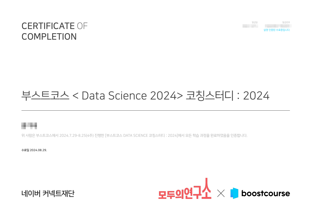 | [의료AI] 감염병 데이터 활용 데이터 분석 교육 수료 후기 (0) | 2024.08.25 |