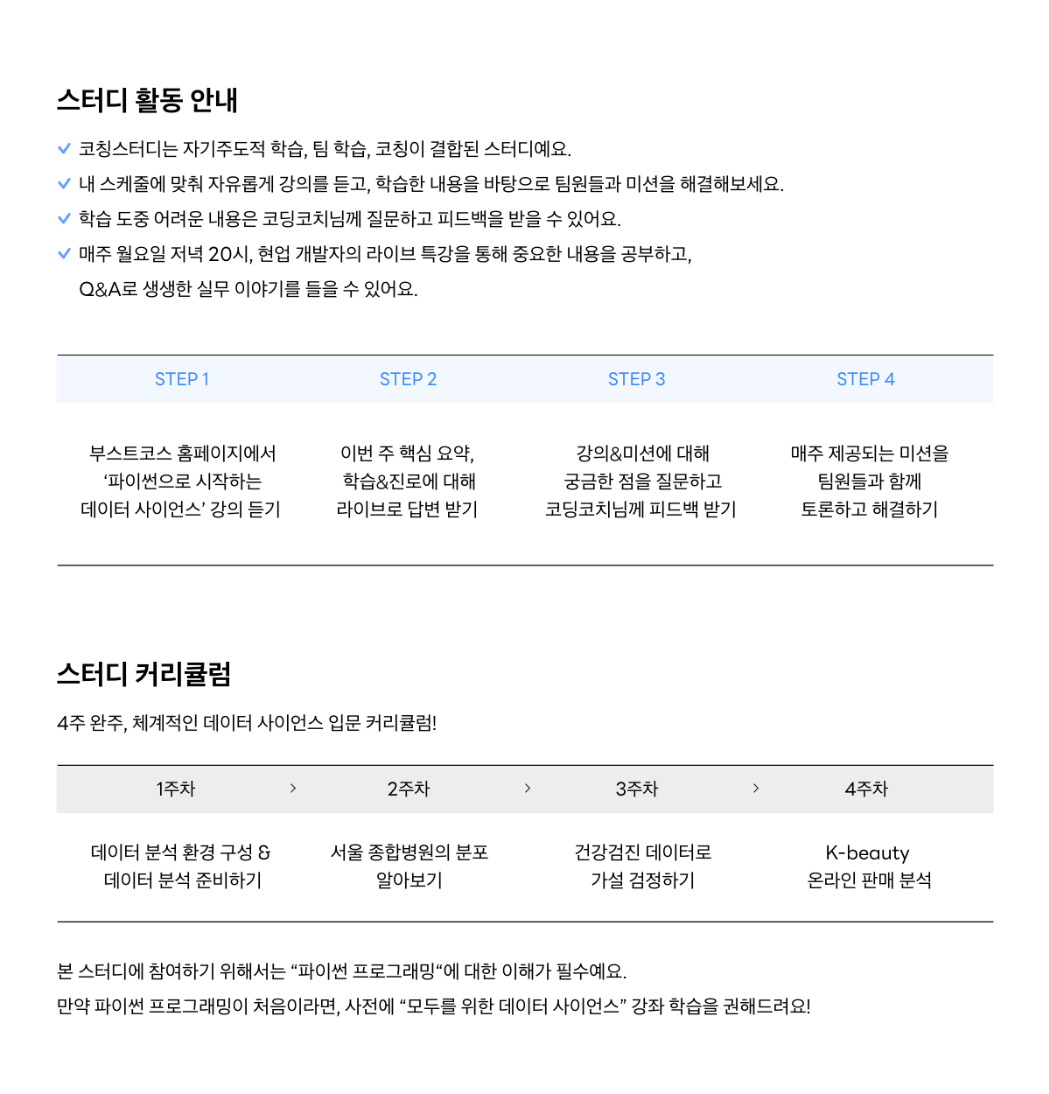 혹시, 데이터사이언스에 입문하고 싶다면 추천하고 싶다. 팀 학습을 통해서 혼자하면 느슨해질만한 부분들을 잡아줄 수 있는 동료들이 있어. 중간에 포기하지 않고 완주할 수 있도록 해준다.